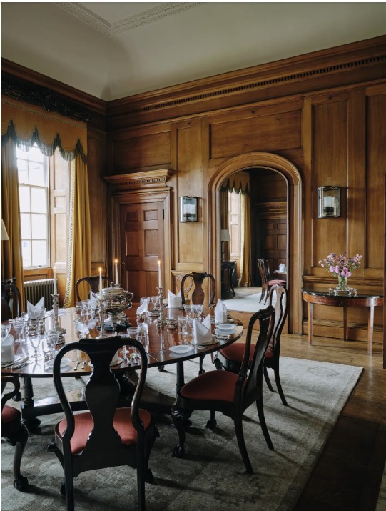 Dining Room at Radbourne Hall, Derbyshire, with its original 18th century oak paneling, stripped and waxed by Fowler. Image from “House and Garden.”