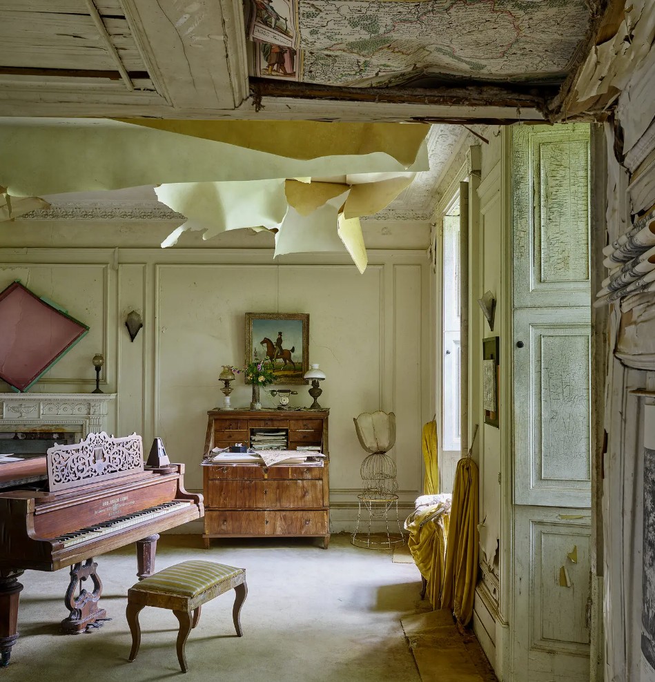 In the case of the domestic interior at Brodsworth House and elsewhere, “curated decay” is also a story of aristocratic continuity and aristocratic decline: the great house, the dwindling fortune, the threadbare carpet that stays threadbare because there is no money left to replace it and no servants to repair it. The long economic squeeze on the country house, from the time that estates began to complete with cheap North American grain in the 1870s to raising income tax in the early twentieth century (the rate increased from six percent in 1914 to thirty percent by 1918), produced a vast amount of genuine, unintended decay inside England’s grandest rooms. The Second World War completed what the first had started. Houses were commandeered, often returned to their owners in poor repair, and they were subject to building restrictions that prioritized post-war reconstruction elsewhere. By the 1950s, a vast amount of genuine and unintended decay existed inside England’s grandest houses.